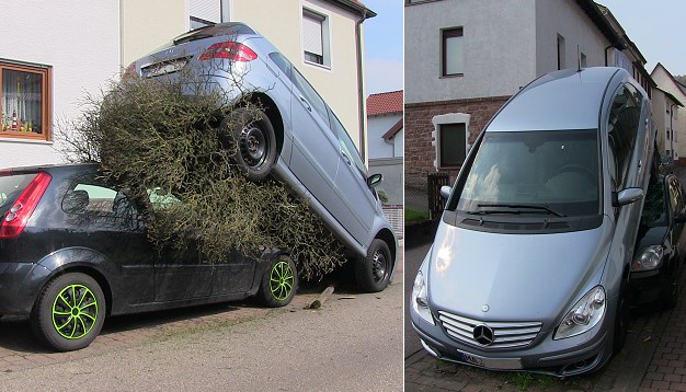 Die Fahrerin eines Mercedes aus der Region Mannheim war auf Besuch in Eberbach. Beim Einparken im Kirchenweg kam es zu einem Missgeschick, bei dem sie mit eingelegtem Rückwärtsgang an dem Automatik-Pkw vermutlich Gas- und Bremspedal verwechselte. Der Wagen schoss unvermittelt rückwärts, drückte einen Straßenbaum um und schob sich nahezu vollständig auf Motorhaube und Dach eines dahinter parkenden Ford Fiesta auf.