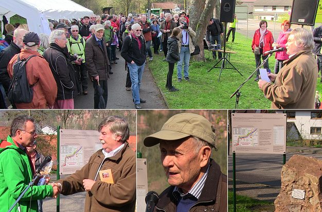Vorbildliche Privatinitiative hält Zeitgeschichte lebendig Oben: Harald Rupp (r.) bei seiner Ansprache. Unten v.l.: Dietmar Polzin vom Heimat- und Verkehrsverein dankt Rupp für sein Engagement, Hans Klinge und die Infotafel mit Sandstein am Wanderparkplatz, wo die Route beginnt und endet. (Fotos: Hubert Richter)(hr) Ein informativer Rundwanderweg wurde heute im Eberbacher Ortsteil Pleutersbach offiziell eingeweiht. Die 8 km lange “Route der Sandsteinbrüche” ist durch eine Privatinitiative des ehemaligen Ortsvorstehers Harald Rupp entstanden.