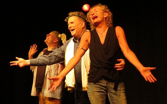 Frecher Satire-Rundumschlag aus Mannheim Kamen vom griechischen Kabarett-Olymp ins Eberbacher Kulturlabor: Hans Georg Sütsch, Wolfgang Schmitter und Josefin Lössl (v.l.). (Foto: Hubert Richter)(hr) Mit seinem aktuellen Programm “Der Letzte lacht das Licht aus” gastierte das Mannheimer Kabarettensemble “Dusche” am 8. April beim Kulturlabor in Eberbach.
