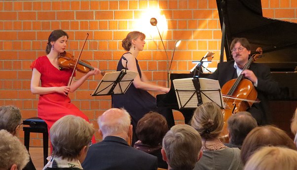 Viertes und letztes Konzert der 67. Reihe 2015/16 (Foto: Claudia Richter)(bro) (khm) Am Freitag musizierte das Würzburger Klaviertrio mit Katharina und Karla Cording (Violine und Klavier) und Peer-Christoph Pulc (Violoncello) in Eberbach im gut besuchten evangelischen Gemeindehaussaal Werke von Beethoven, Chopin, Liszt und Dvoøák. Das Ensemble, dem der Ruf vorausgeht, „eines der führenden Klaviertrios der Gegenwart“ zu sein, und das sich der Aufgabe verschrieben hat, auch kammermusikalische Juwelen zu präsentieren, wurde seinem Ruf auch bei den Kunstfreunden vollauf gerecht.