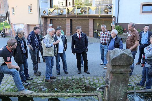 Themen aus dem Ortsteil mit der Stadtverwaltung besprochen (Foto: Thomas Wilken)(tom) Der undichte Brunnen im Mitteldorf, ein absinkender Randstreifen und notwendige Sanierungen an der ehemaligen Schulen standen im Mittelpunkt einer Ortsbegehung in Brombach, zu der sich Mitglieder der Eberbacher Stadtverwaltung mit Bürgermeister Peter Reichert an der Spitze, Ortsbeiräte und interessierte Bürger eingefunden hatten. Natürlich wurde auch die Verbindungsstraße nach Heddesbach angesprochen. Eine Bürgerversammlung schloss sich an.
