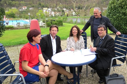 Bald beginnt die Freiluft-Badezeit Der Pachtvertrag für die Cafeteria im Badezentrum ist unterschrieben. (Foto: Claudia Richter)(cr) Bei Temperaturen im einstelligen Bereich ist es kaum vorstellbar, dass man in den nächsten Wochen im Eberbacher Freibad schwimmen kann. Doch alle Vorbereitungen sind getroffen, und die Pächter der Cafeteria stehen in den Startlöchern.
