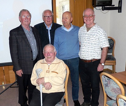 Ein interessanter Vortrag nicht nur für Benzinkranke Michael Schmitt (r.) wurde begleitet vom damaligen Organisator der Krähbergrennen, Heinz Walter (Erbach) (li.), Rennarzt Dr. Raimund Keysser (Beerfelden) (2. v. r.) und dem Vertreter von Veith-Pirelli an den Rennstrecken, Peter Petit (Höchst) (sitzend). Vorsitzender Horst Schnur (2. v.l.) dankte für die Dorfgemeinschaft Olfen. (Foto: privat)(bro) (sch) Rund um das traditionsreiche Krähbergrennen ging es beim jüngsten Dorftreff Olfen im Gasthaus „Zum Spälterwald“. Michael Schmitt ließ die Rennmotoren aufheulen und die Erinnerungen an die damaligen Ereignisse zwischen Hetzbach und Schöllenbach in seinem Vortrag mit Lichtbildern wieder wach werden.