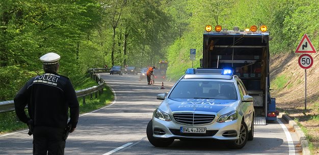 An dem Motorrad entstand Schaden von 2.000 Euro. Während der Unfallaufnahme und den aufwändigen Reinigungsarbeiten (unser Bild) war für mehrere Stunden eine halbseitige Sperrung der L 524 notwendig. Der Verkehr konnte an der Unfallstelle vorbeigeleitet werden.