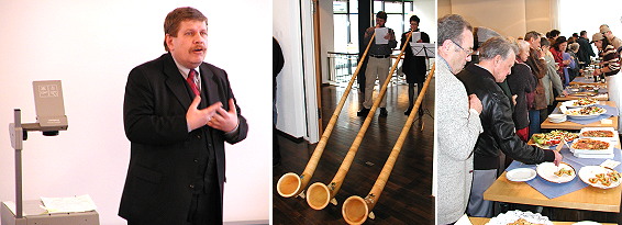 Offizielle Eröffnungsveranstaltung mit Fachreferat Referent Dr.Mautner, Alphornbläser und die Schlacht am Büffet als Highlights (Fotos:Claussen)(jc) Rund 120 Freunde des Bärlauchs kamen gestern zur offiziellen Eröffnungsveranstaltung der Eberbacher Bärlauchtage. Kern der Veranstaltung war, neben Grußworten des Bürgermeisters, von Werner Helm (Arbeitskreis Tourismus) und Jürgen Klier (Pleutersbacher Weinstube) als Vertreter von Uwe Jung (Hotel Krone-Post), der mit den Folgen des Hochwassers kämpfen musste und verhindert war, ein Fachreferat von Dr. Mautner von der Firma Salus Haus. Er beleuchtete die gesundheitlichen Aspekte des „Grünen Goldes“. Bärlauch sei unter anderem förderlich bei der Behandlung von Magen-Darm Störungen, Arteriosklerose Bluthochdruck und leite Schwermetalleinlagerungen des Körpers aus.