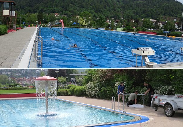 Endlich ist sie da, die von vielen Badebegeisterten lang ersehnte Freibadsaison. Seit heute Morgen 7 Uhr darf in den drei Kinderbecken und im 50-Meter-Becker im Freibad in der Au geschwommen und geplanscht werden. Stefanie Meier, Meisterin für Bäderbetriebe, und ihr Bäderteam haben in den vergangenen Wochen dafür gesorgt, dass das Freibad samt Gelände für die Sommersaison fit ist. Heute luden die Stadtwerke Eberbach zum ersten Badetag bei freiem Eintritt in das idyllisch gelegene Freibad ein. Etliche Gäste nutzten die Möglichkeit und zogen ihre Bahnen im mindestens 24 Grad warmen Wasser, während Meier und Mitarbeiter der Stadtwerke noch kleinere Arbeiten verrichteten und eine neue Sitzbank am Kinderbecken installierten.