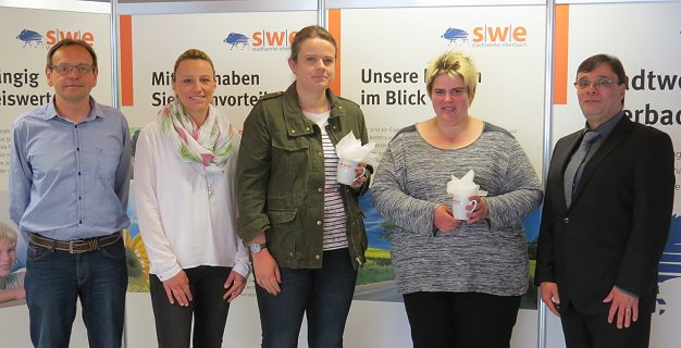 Anne Fabricius und Melanie Dir haben von Stadtwerkeleiter Günter Haag im Beisein der SWE-Mitarbeiter Michael Sigmund und Nicole Kastner die Dauertickets für die Freibadsaison 2016 erhalten. Der dritte Gewinner, Nicolas Andres, war nicht anwesend.