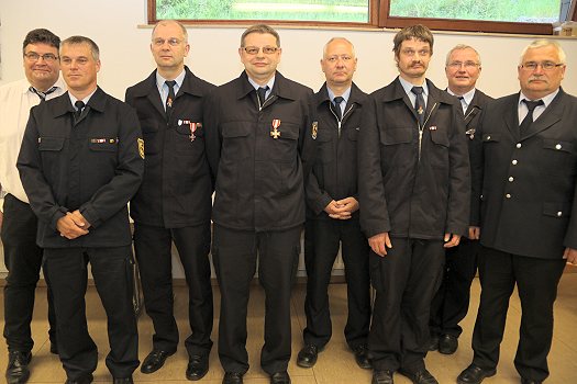 Vier hochkarätige Ehrungen für langjährige Dienstzeit in der Einsatzabteilung standen ebenfalls an. Bereits 40 Jahre aktiv sind Michael Beisel und Uwe Tillich. Sie traten 1976 der Jugendwehr bei, wechselten 1980 in die Einsatzabteilung und waren zwischendurch auch als Jugendwarte aktiv. 30 Jahre opfern der Wehr Jörg Kumpf und Georg Krebs ihre Freizeit. Alle wurden von Wehrführer Albert, Bürgermeister Sens und Werner Trares ausgezeichnet.