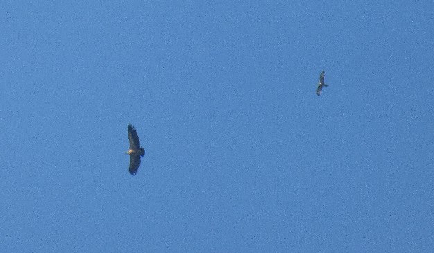 Beide trauten ihren Augen nicht, als sich die 14 Großvögel in den Himmel hochschraubten. Der Ornithologe meldete die sensationelle Sichtung am 9. Mai in Mudau-Reisenbach um 10.45 Uhr sogleich beim Dachverband Deutscher Avifaunisten (DDA). Die Spaziergängerin, die auf dem Hebert im sogenannten „Bannholz“ unterwegs war, machte um 11.15 Uhr zufällig Fotos, wusste aber nicht, was da Großes über die Baumwipfel flog. Der Schnappschuss offenbarte es: Es handelte sich um einen Trupp aus zwölf Gänsegeiern und zwei Mönchsgeiern.
