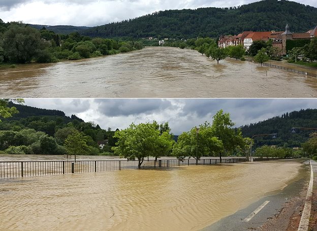 Im Lauf des gestrigen Montags stiegen die Pegelstände steil an. In Hirschhorn war bald die Uferstraße überflutet, in Eberbach zunächst der Neckarlauer und am Mittag dann auch die Bundesstraße 37. Glücklicherweise fiel der Wasserstand ab dem frühen Abend wieder, so dass größere Schäden ausblieben. In Eberbach hatte der Neckar bis dahin einen Pegelstand von rund 6, 20 Metern erreicht.