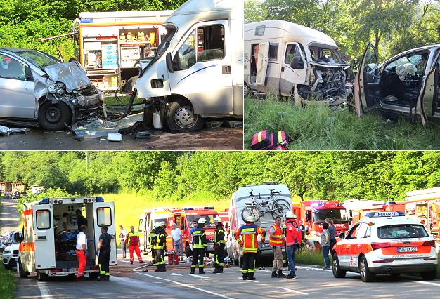 Frontalzusammenstoß zwischen Pkw und Wohnmobil (Fotos: Claudia Richter)(cr) Ein Todesopfer und drei Schwerverletzte forderte heute am späten Nachmittag ein Verkehrsunfall auf der Bundesstraße 37 zwischen Eberbach und Lindach.