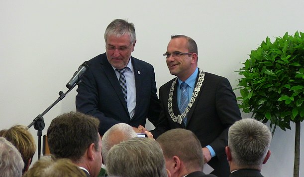 Zwölf humorvolle Regeln für die zweite Schönbrunner Amtszeit Jan Frey (r.) nach der Verpflichtung durch seinen Stellvertreter Jürgen Dinkeldein. (Foto: Hubert Richter)(hr) Feierlich für seine zweite Amtsperiode verpflichtet wurde heute Abend Schönbrunn Bürgermeister Jan Frey.
