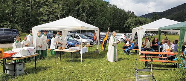 Nach der gemeinsamen Feldmesse, unter Mitwirkung der katholischen Pfarrkapelle und der Kinderkirche, hatten die Mitglieder der Kolpingsfamilie alle Hände voll zu tun. Es wurde Erbseneintopf, Bratwurst sowie Kaffee und Kuchen angeboten.