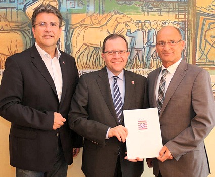 Investitionen von 439.000 Euro werden gefördert (Foto: Thomas Wilken)(tom) Wenn eine Stadt aus dem kommunalen Investitionsprogramm (KIP) gleich Fördermittel für Projekte von 439.000 Euro erhält, dann ist das zur Übergabe der Förderbescheide auch einen Besuch des Staatssekretärs wert. Thomas Metz aus dem hessischen Justizministerium war in die Stadt am Berge gekommen, um insgesamt neun Bescheide an Bürgermeister Gottfried Görig zu überreichen. Metz kennt als ehemaliger Beigeordneter im Kreis Bergstraße und Stadtverordneter von Lorsch die kommunale Materie aus eigener Anschauung.