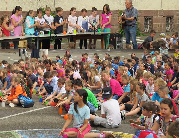 Unter Anleitung der Schülerinnen und der Schüler der Klasse 4a mit ihrem Klassenlehrer Christoph Reincke (Bild oben) wurden die Grundschulkinder seit Tagen für dieses Event fit gemacht. Auch die Schülerinnen und Schüler des SBBZ haben lange geübt, und so konnte gestern um 9 Uhr zum ersten Mal der "Cup-Song” öffentlich in Eberbach aufgeführt werden. Kurze Einleitung von den Viertklässlern mit Reincke an der Gitarre und alle Kinder präsentierten den Becher-Rap mit Händeklatschen und Plastikbecher-Rhythmus. Einige Eltern wohnten dem außergewöhnlichen Spektakel bei und sahen, dass die wochenlangen Probeeinheiten mit Becher ihrer Schützlinge im heimischen Wohnzimmer erfolgreich waren.