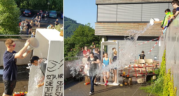 Schüler gingen unter Wasserbeschuss an Bord der Abinautic Airline (Fotos: Patricia Trinkaus)(pt) Die traditionelle Schulstürmung der Abiturienten am Hohenstaufen-Gymnasium sorgte gestern bei sommerlicher Hitze für nasse Kleidung und lachende Gesichter.