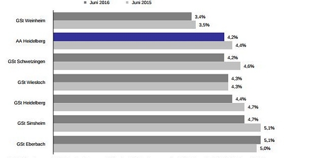 Noch viele unbesetzte Ausbildungsstellen Arbeitslosenquoten im Juni. (Grafik: Bundesagentur für Arbeit)(bro) (aa) Die Zahl der arbeitslosen Menschen im Heidelberger Agenturbezirk ist von Mai auf Juni um 243 auf 15.450 Personen gesunken. Gegenüber dem Vorjahresmonat ist die Arbeitslosigkeit um 647 niedriger. Die Arbeitslosenquote ist um 0,1 zurückgegangen und beträgt jetzt 4,2 Prozent.