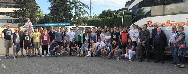 Ein sportlicher Besuch bei Freunden (Foto: privat)(bro) (as) Seit Herbst 2015 liefen die Vorbereitungen. Am letzten Freitagmorgen fuhren 55 Jugendliche mit ihren Betreuern und der Vorstandschaft des Sportausschusses Eberbach in Richtung der Partnerstadt Thonon les Baines in Frankreich. Neben Jugendmannschaften von VFB und SV Eberbach sowie zweier C-Jugend-Teams der HG Eberbach war der Bogensportverein Eberbach zum ersten Mal mit einer Abordnung vertreten.
