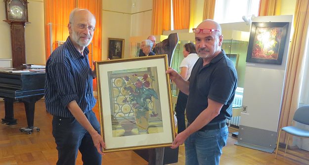 Die Vernissage nahmen Stupperich und das Team des Museumsvereins zum Anlass, eine großzügige Spende an das Museum anzunehmen und gebührend zu feiern. Michael Laule übergab am Nachmittag ein Stillleben von Richard Hemberger im Auftrag des bisherigen Besitzers, dessen Eltern das Bild anlässlich ihrer Hochzeit im Jahr 1933 von Freunden aus Eberbach geschenkt bekommen hatten. Es hing bisher in Frankenthal (Pfalz). Der Spender selbst konnte vorgestern an der kleinen Feier nicht teilnehmen, versicherte aber, dass das Blumengemälde jetzt dem Museum gehöre. Es kann während der Ausstellung im Ratssaal des Museums bewundert werden.