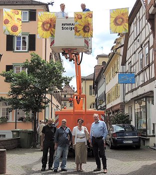 Banner sollen Altstadt attraktiver machen Auf dem Steiger und vor dem Steiger: Bürgermeister Peter Reichert, Wilfried Schäfer, Murat Yorulmaz, Jürgen Cress, Rena Ott-Seidel, Dietrich Müller - von der Projektgruppe imakomm. (Foto: privat)(bro) (ts) Die Projektgruppe „Umsetzung der Ergebnisse aus dem Entwicklungskonzept Einkaufs- und Dienstleistungsstandort Eberbach“ hat die Bildung einer sogenannten Achse in der Innenstadt durch Aufhängen von Motiven in der Kellereistraße vorgeschlagen. Der Gemeinderat hat dies so beschlossen, und so erfolgte heute die Umsetzung. Das erste Motiv sind Sonnenblumen. Weitere Motive sollen folgen.