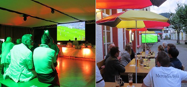 EM-Viewing bei Gastronomen und in der Stadthalle (Fotos: Claudia Richter)(cr) Gemeinsam das EM-Viertelfinalspiel Deutschland gegen Italien ansehen war am vergangenen Samstag in Eberbachs Innenstadt möglich. In der Stadthalle konnte anschließend der Sieg der deutschen Nationalmannschaft bis in die frühen Morgenstunden gefeiert werden.