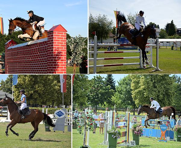 Mächtigkeitsspringen mit zwei Siegern (Fotos: privat / Barbara Gusz)(bro) (am) Der traditionelle Publikumsmagnet des Pferdemarkt-Turniers in Beerfelden ist das Mächtigkeitsspringen (SB-Springen) am Samstag. Am 9. Juli, bei strahlendem Sonnenschein, bekamen die Zuschauer ein hochklassiges Springen der zwölf Paare geboten. Im dritten Stechen bei einer Mauerhöhe von 2 m blieben Kevin Dües (ZRFV Altenberge) und Alexander Kisselbach (RV Am Pohlheimer Wald) fehlerfrei und teilten sich den ersten Platz. Kevin Dües konnte damit seinen Sieg aus dem Vorjahr wiederholen.