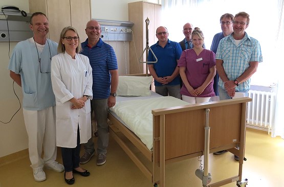 Insgesamt halten etwa 300 Mitarbeiterinnen und Mitarbeiter den Krankenhausbetrieb mit 130 Planbetten am Laufen. Neben dem normalen Alltag können bis zu drei Palliativpatienten betreut werden. Um ihnen und ihren Angehörigen trotz der Situation eine heimelige Atmosphäre bieten zu können, wird je nach Bedarf ein Krankenzimmer entsprechend umgestaltet. Von Schwan und ihrem Palliativteam sei der Wunsch nach einem wohnlich aussehenden Pflegebett gekommen, so der stellvertretende Leiter der GRN-Klinik Ralf Geiger und Pflegedienstleiter Michael Spiegelberg. Mit dem Mosbacher Sanitätshaus Schach, das auch in Eberbach eine Filiale betreibt, hat man nun einen Spender für das benötigte Mobiliar gefunden. Gestern übergaben Jürgen Steck und Nico Roffalski vom Santitätshaus neben einem Bett mit einer Matratze für Weichlagerung auch einen Nachttisch an Geiger und seine Mitarbeiterinnen und Mitarbeiter. Die Möbel seien rollbar, und so könne ein Patientenzimmer mit wohnlichem Charakter auf allen Stationen eingerichtet werden, freuten sich die Beschenkten.