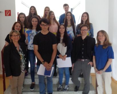 Die stellvertretende Vorsitzende der Europa Union Rhein Neckar A. Leitner – Leinbach überreichte die Preise und Urkunden am Hohenstaufen – Gymnasium unter Betonung der hohen Qualität der eingereichten Arbeiten. Neben vier Lokalpreisen und neun Landespreisen überzeugten die Arbeiten von Michelle Ivankov, Julia Frauenschuh und Dominic Niedermüller (Klasse 9 unter Leitung von Nadine Detjen) sowie von Selin Hacikoglu und Tim Dengel (Neigungskurs Bildende Kunst Kursstufe I unter der Leitung von Sebastian Schäuffele) die Jury so sehr, dass sie für einen Bundespreis vorgeschlagen wurden.