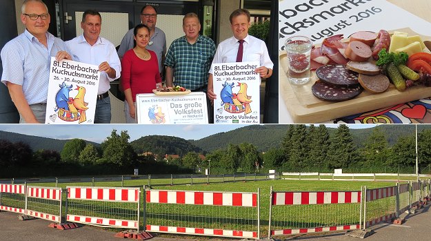 Gemeinsam mit Bürgermeister Peter Reichert, Festzeltwirt Gerhard Rebscher und Roland Brandt von der Brauerei, die in diesem Jahr wieder für das Bier zuständig ist, stellten Soldner und Walter das diesjährige Festprogramm vor. Der Familiennachmittag mit teilweise ermäßigten Preisen beginnt am Freitag, 26. August, ab 15 Uhr. Offizieller Fassbieranstich im Festzelt zu den Klängen des Fanfarenzugs der Stadt Eberbach ist um 18 Uhr. Vor der Eröffnung werden an die ersten 1.000 Besucher Freigetränk-Gutscheine verschenkt, die direkt im Festzelt eingelöst werden können.