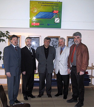 Träger des alternativen Nobelpreises referierte in Schwarzach Vor der schon mehrere Jahre problemlos arbeitenden Photovoltaik-Anlage, die ohne fremde Förderung installiert wurde, stellten sich die Verantwortlichen der interessanten Veranstaltung zum Erinnerungsfoto: (v.l.) KR. Karlheinz Graner , BM Theo Haaf, MdB Dr. Hermann Scheer, MdL Gerd Teßmer und OVV Roland Liebig.(jc) (gt)„Unsere Gesellschaft befindet sich in einer riesigen Energielüge“. Mit dieser Behauptung begann Dr. Hermann Scheer, Bundestagsabgeordneter und Träger des alternativen Nobelpreises seine Ausführungen einer Vision in eine Solargesellschaft. Auf Vermittlung des SPD-Kreisverbandes hatte Bürgermeister Theo Haaf öffentlich eingeladen. Begrüßen konnte der Bürgermeister den SPD-Landtagsabgeordneten Gerd Teßmer, die SPD-Kreisrätin Annemarie Frey und die Kreisräte Karlheinz Graner und Rainer Schäfer und die Vertreter der SPD-Ortsvereine des Kleinen Odenwaldes, sowie Gemeinderat und Ortsvereinsvorsitzenden Roland Liebig.