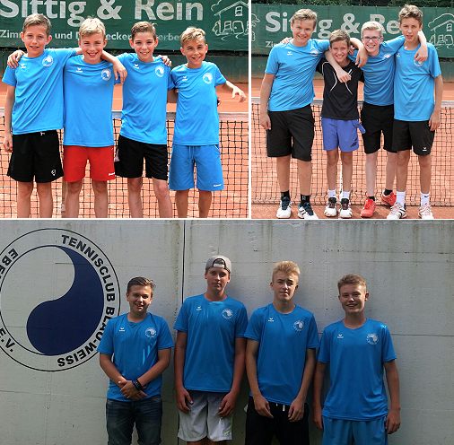Fünf Jugendmannschaften eroberten die Tabellenspitze V. l. oben: U12 und U14. Unten: U16. (Fotos: privat)(bro) (js) Durch Spielgewinne in den letzten Rundenbegegnungen eroberten fünf Jugendteams des TC Blau-Weiß die Tabellenspitze und können sich Gruppensieger nennen. In der zweiten Bezirksliga sind dies die Junioren U16 mit Frederick Emmerich, Kevin Juschka, Max Wuscher und Niklas Wincher, die mit einem 3:3 gegen die unmittelbaren Verfolger vom TC TW Wiesloch die Nase vorne hatten.