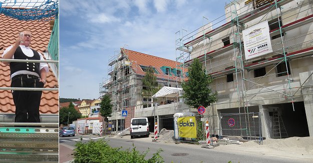 Mit einem Richtspruch wurde das Gebäude nach altem Brauch von Benjamin Müller, Geschäftsführer von Müller Dach und Holzbau, geweiht (Bild links). Mohr geht davon aus, dass die Bauphase Ende 2016 bis Anfang 2017 beendet sein wird. Die Neckarstraße wird laut städtischem Bauamt weiterhin wie bisher für den Durchgangsverkehr gesperrt bleiben.