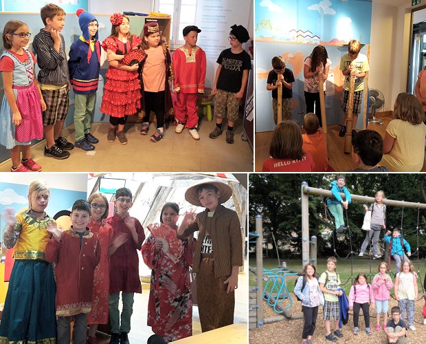Vor der Fahrt wurden noch Lunchpakete verteilt, die von den Kindern begeistert angenommen wurden. Im Stadtmuseum Neckarsulm wurde die Gruppe begrüßt und in die „Abflughalle“ gebracht. Die Ausflügler reisten durch sechs Kontinente. Für diese Reise durften sich die Kinder verkleiden und mitspielen. Sie waren von den vielen Eindrücken begeistert, und viel zu schnell verging die Zeit. Zum Abschluss besuchte man noch einen Spielplatz, auf dem gegessen und getobt wurde. Am Nachmittag kam man mit vielen neuen Eindrücken wieder in Eberbach an.