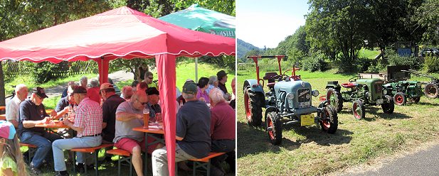 Unterstützt wurde der MGV von den Schlepperfreunden aus Allemühl, die am Sonntag im Konvoi kurz vor 11 Uhr zum Schlepperfrühschoppen eintrafen. Dabei war ein 61 Jahre alter Lanz Bulldog - der älteste Traktor unter den Oldtimern, auf den sein Eigentümer Peter Heiß aus Allemühl sehr stolz ist. Selbst Traktoren aus Moosbrunn-Schönbrunn sowie Lindach waren zu bestaunen. Der Präsident der Urmel, Joachim Schwab, kam von Neckarwimmersbach mit dem Urmel-Bulldog angereist. Zu sehen waren Marken wie Lanz-Hanomag-Deutz-Güldner-Eicher-Ford-Mc Cormick-Holder-sowie Agrias. Unimog-Fahrer Wastl von den Eulenspiegeln war auch vor Ort mit seinem treuen Gefährt.