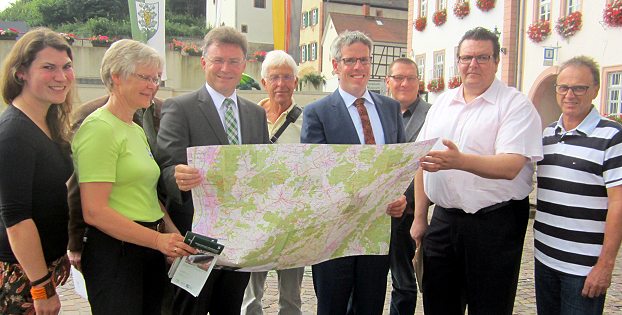 Neue Herausgeberschaft, angepasstes Design und aktualisierte Informationen Achim Brötel (6.v. r., Landrat Neckar-Odenwald-Kreis, 1. Vorsitzender Naturpark Neckartal-Odenwald) und Christian Engelhardt (4. v. r., Landrat Kreis Bergstraße, 1. Vorsitzender UNESCO-Geopark) präsentierten die neue Wanderkarte Nr. 5 gemeinsam mit (v. r.) Klaus Johe (Tourismus Stadt Lindenfels), Michael Helbig (Bürgermeister Stadt Lindenfels), Cordula Samuleit (Geschäftsführerin Naturpark Neckartal-Odenwald), Rainer Türk (Hauptwegewart Naturpark Neckartal-Odenwald) Michael Messer (MeKi-Verlag), Helmut Zander (Hauptwegewart UNESCO-Geopark) sowie Christiane Stolz (Infrastruktur, UNESCO-Geopark). (Foto: privat)(bro) (nok/el) Das Wanderkartenwerk des Naturparks Neckartal-Odenwald erfreut sich seit mehr als 15 Jahren großer Beliebtheit. Nun wird die Serie sukzessive überarbeitet und auch im Design angepasst, wie kürzlich die Verantwortlichen, allen voran die Landräte Dr. Achim Brötel (Neckar-Odenwald-Kreis, 1. Vorsitzender Naturpark Neckartal-Odenwald) und Christian Engelhardt (Kreis Bergstraße, 1. Vorsitzender UNESCO-Geopark) sowie Cordula Samuleit (Geschäftsführerin Naturpark Neckartal-Odenwald), Christiane Stolz (Infrastruktur, Geo-Naturpark) und Michael Messer (Geschäftsführer MeKi-Verlag) im Rahmen eines Pressegesprächs erläuterten.