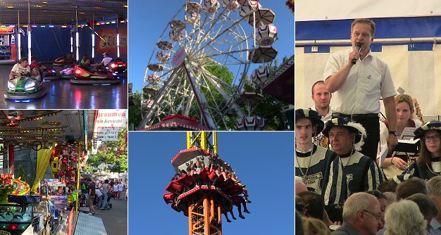 Fahrgeschäfte bieten Spaß und Nervenkitzel. Mit dabei ist in diesem Jahr unter anderem ein 38 Meter hoher Freefalltower (Bild unten MItte). Aber auch Klassiker wie Autoscooter oder der Musik-Express fehlen nicht. Und das vom letzten Jahr bekannte “Nostalgie-Riesenrad” lädt wieder zu aussichtsreichen Fahrten ein (Bild oben Mitte).