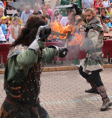 Viele Spielmänner und -frauen waren vertreten: Die Veteranen von „Des Geyers schwarzer Haufen“, „Musica Canora“ und das Ensemble „Triskilian“. In der Tradition der fahrenden Sänger bereisen Jan Rolph und sein Weib Helene von Holzerode als „Die Heidweilers“ die Lande. Beim abendlichen Tavernenspiel mit feurigem Spektakel erlebten die Besucher noch einmal alle Akteure zusammen. Gerade am sonnigen Samstag war der Chateau-Landon-Platz zu diesem Anlass brechend voll. Viel Applaus war den Akteuren für ihre Darbietung gewiss.