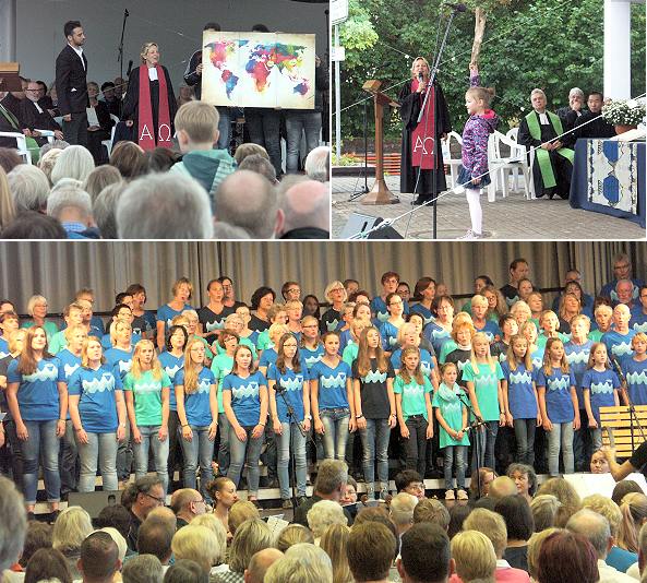 Vom Fluss, vom Wasser und vom Glauben  Links oben: Anhand einer Weltkarte zeigte Pfarrerin Marion Rink im Gottesdienst auf, dass Menschen teilweise von weither zum Dekanatskirchentag gekommen waren. Rechts oben: Neckar-Treibholz bildete ein wichtiges Motiv des Tages. Unten: Volles Haus beim Musical „Die Wellen des Lebens“. (Fotos: privat)(bro) (bb) Eine neue Sprache zu finden für die zeitlos frohe Botschaft, welche die Kirche zu verkündigen hat, ist eine der Herausforderungen, die Dr. Karl-Heinz Schell sieht. Der Dekan des Evangelischen Dekanats Odenwald und sein badischer Amtskollege Ekkehard Leytz (Dekanat Neckargemünd-Eberbach) äußerten sich zu der Frage „Wohin treibt es uns?“ bei einer von Präses Jan Heidrich (Michelstadt) moderierten Gesprächsrunde während des 34. Odenwälder Dekanatskirchentages. Dieser fand am Sonntag in Hirschhorn statt und stand unter dem Titel „Flussgeschichten: An Strömen lebendigen Wassers“.