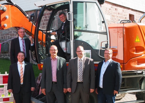 Neckar-Odenwald-Kreis Ende 2017 flächendeckend ausgebaut Mit Baggerfahrer Dr. Achim Brötel startete im Beisein von Bürgermeister Markus Haas (links vorn) und Dr. Norbert Rippberger (links hinten) gestern in Waldkatzenbach der vierte Bauabschnitt „Breitbandversorgung“. Bis Mitte 2017 soll in den Gemeinden Waldbrunn und Mudau für 95 Prozent der Bürger die Datenautobahn realisiert worden sein. Auch Telekom-Regionalmanager (Mitte), Projektkoordinator „Mister Breitband“ Johannes Biste (2.v.re.) von der WINO und Geschäftsführer Bernhard Kirschenlohr (re.) von der Baufirma Schuler-Bau Mosbach. (Foto: Hofherr)(hof) Auf die Odenwald-Autobahn für Kraftfahrzeuge wartet man im Neckar-Odenwald-Kreis seit vielen Jahrzehnten vergebens, und das Warten wird sich weiter strecken, möglicherweise bis zum St. Nimmerleinstag. Schneller geht es mit der sogenannten Datenautobahn, dem Breitbandanschluss von 95 Prozent aller Haushalte im Neckar-Odenwald-Kreis mit einer vertraglich von der Telekom AG garantierten Bandbreite von 30 MBit je Sekunde. Dank technischer Neuerungen wie das sogenannte „Vectoring“, das mindestens 50 MBit/s.