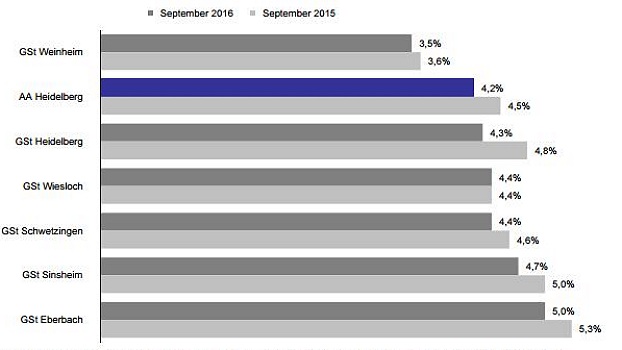 Positive Entwicklung auf dem Arbeitsmarkt Arbeitslosenquoten im September. (Grafik: Bundesagentur für Arbeit)(bro) (aa) Von August auf September ist die Zahl der arbeitslosen Menschen im Heidelberger Agenturbezirk um 681 auf 15.523 Personen gesunken. Gegenüber dem Vorjahresmonat ist die Arbeitslosigkeit um 752 niedriger. Die Arbeitslosenquote ist um -0,2 Prozentpunkte zurückgegangen und beträgt jetzt 4,2 Prozent.