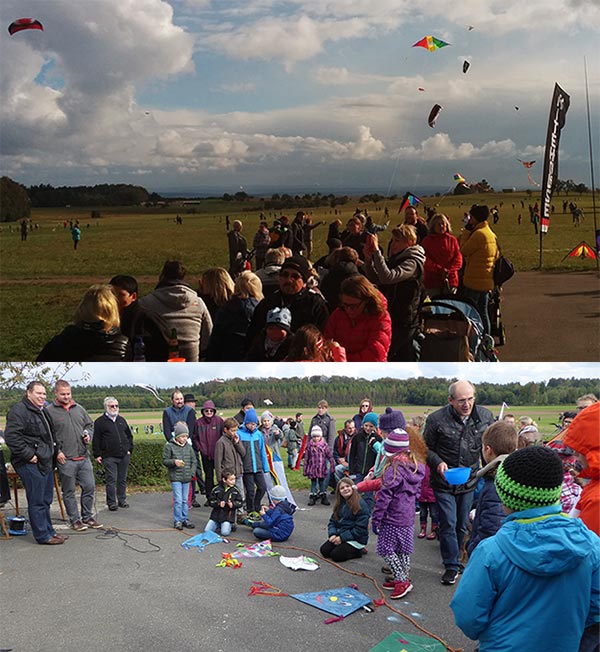 Während in der Ferne etliche Regenschauer niedergingen, hielt hier der Pakt der Segelflieger mit dem Wetter. Ein lauer Herbstwind ließ viele bunte Drachen und schwarze Fledermäuse in den Himmel steigen, nur für die meisten Lenkdrachen war an diesem Sonntag der Wind zu schwach.