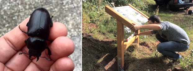 Neue Infotafel weist auf die Lebensweise des Hirschkäfers hin (Fotos: privat)(bro) (pm) Schon seit einem Jahr hat die Stadt Eberbach einen Hirschkäfermeiler, auch wenn ihn nicht viele Menschen bemerkt haben. Gebaut wurde er von den Schülern des HSG im Rahmen des NwT-Unterrichts unter der Leitung von Edit Spielmann.