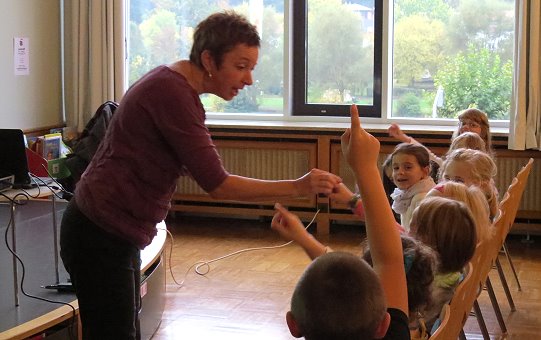 Bibliotheksleiterin Luzia Scharf konnte am Donnerstagvormittag Jutta Nymphius begrüßen, die bei den diesjährigen Frederick-Wochen aus ihren Kinderbüchern liest. In Eberbach kamen die Schülerinnen und Schüler der zweiten Klassen der Dr.-Weiß-Grundschule sowie Kinder der dritten und vierten Klassen der Dr.-Weiß-Schule Sonderpädagogisches Bildungs- und Beratungszentrum mit Förderschwerpunkt Lernen in den Genuss der Autorenlesung. Und die war besonders aufregend, denn in der Geschichte ging es um einen Feueropalring, den die Autorin in der Stadtbibliothek sogar dabei hatte.