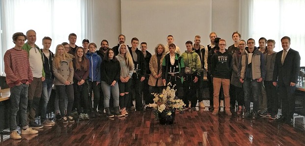 Am Mittwoch, 26. Oktober, wurden die norwegischen und deutschen Schüler von Bürgermeister Peter Reichert im Rathaus empfangen. Im Sitzungssaal des Rathauses stellte Reichert die Stadt Eberbach vor, hieß die Gäste willkommen und nahm sich viel Zeit für die Fragen der Schülerinnen und Schüler. Anschließend folgte mit dem Gemeindeförster Joachim Maier am Breitenstein eine Forstbegehung, die viel Information über die Region lieferte.
