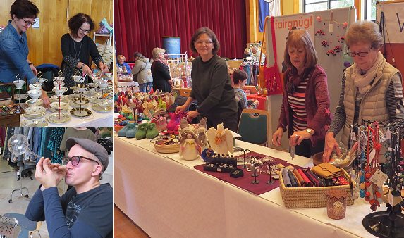 Zum ersten Mal sind Etageren und Lampen aus Porzellansammeltassen auf dem Kreativmarkt zu bestaunen. Rebecca Müller aus Heidelberg verarbeitet seit etwa vier Jahren Sammeltassen zu Etageren, bei Bedarf könnten sogar persönliche Lieblingsstücke von der Hobbykünstlerin umgearbeitet werden. Einem Glasbläser darf bei der Arbeit ebenso zugesehen werden wie den Damen und dem Herrn des Spinnzirkels Eberbach. Unter der Leitung von Christa Haas wird im Foyer gesponnen, was die Spulen hergeben.