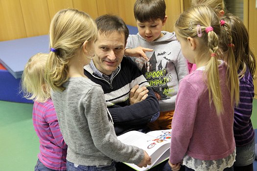 Mit der ersten Kleingruppe zog er sich in den Turnraum zurück. Dort zauberte er einen schön bebilderter Kinderbuchklassiker von Astrid Lindgren aus dem Rucksack mit dem Titel „Na klar, Lotta kann Rad fahren“. Er fahre selbst so gerne Fahrrad, verriet der Abgeordnete. Er las die Geschichte von dem Mädchen Lotta, das sich zum fünften Geburtstag ein Fahrrad wünscht, vor, und die Kinder waren ganz bei der Sache. Lotta hat Wünsche, sie hat ihren eigenen Kopf, fällt auch mal auf die Nase, aber steht gleich wieder auf. Wer will sich damit nicht identifizieren?
