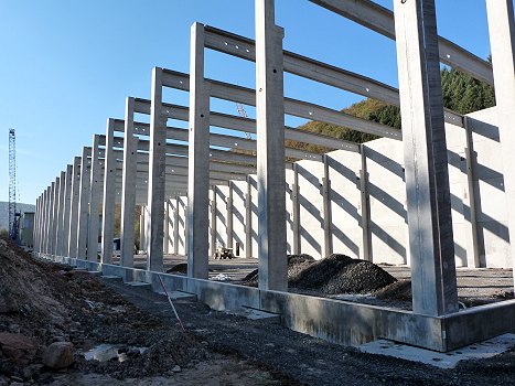 Inzwischen steht schon das Gerippe der neuen Montagehalle, so dass man sich die Dimensionen gut vorstellen kann. Die Gesamtabmessungen der Halle plus Bürotrakt betragen ca. 36 und 102 m. Seit Baubeginn am 1. September wurden Kanalarbeiten durchgeführt und die Fundamente für die Stützen und Bodenplatte vorbereitet. Stützen, Binder und Wandscheiben wurden als Fertigteile per Schwertransport angeliefert.