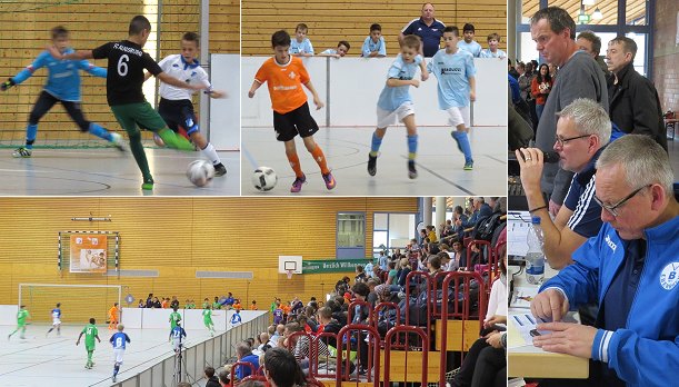 Nationales Jugendfußballturnier in der Hohenstaufen-Sporthalle O.l. ein Torjäger des Turniersiegers FC Augsburg, daneben in Hellblau das junge Team des Gastgebers VfB Eberbach. Rechts die Turnierleitung mit Frank Mutschler (am Mikrofon) und Tobias Soldner. (Fotos: Claudia Richter)(cr) Der Förderverein des VfB Eberbach lud gestern U12-Fußballteams aus ganz Deutschland zum fünften Mal zum hochkarätigen Jugendfußballturnier nach Eberbach ein. Ermöglicht hatten diese Veranstaltung wieder unter anderem die Hauptsponsoren Elena und Antonio Rugucci von der gleichnamigen Eberbacher Tief- und Straßenbau GmbH.