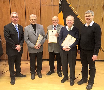 Pfarrer Matthias Stößer und der erste Vorsitzende dankten den Jubilaren Richard Seubert und Hermann Krug für 70-jährige Treue zum Kolpingwerk. Für 60-jährige Pflichterfüllung wurden Gerhard Ebert, Meinrad Münch und Josef Weil geehrt.