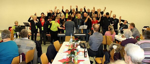 31 Sänger und Sängerinnen standen auf der Bühne und steckten das Publikum mit ihrer Sanges- und Lebensfreude an. Unter dem Motto „Musik & Poesie“ hatte der Chor ein besinnliches und sehr abwechslungsreiches Programm zusammengestellt. Der Inhalt der Lieder wurde durch Gedichte, Rollenspiele oder kleine Sketche vorgestellt. Dass Lieder Brücken sein können, zeigte das erst Lied „Lasst uns eine Brücke bauen“. Ein richtiger Ohrwurm folgte mit „Anders als du“ von Robert Metcalf. In diesem Lied wird das Anderssein in den verschiedensten Möglichkeiten thematisiert. „Da berühren sich Himmel und Erde“, Weihnachten ist auch für mich“ und „Inseln der Stille“ wurden anschließend vorgetragen. Hierbei konnte sich Markus Bachmann als Solosänger sowie Annika Zimmermann als Flötistin hervorheben. Ein weiterer Höhepunkt des Konzerts war „Weit, weit, weg“ von Hubert von Goisern. Eingeleitet durch einen Sketch, bei dem man über die Verständigungsschwierigkeiten von Österreichern, Norddeutschen und Odenwäldern lachen konnte, wurde das Lied im Odenwälder Dialekt (Text Friedemann Buhl) vorgetragen. Auch hier war wieder erstaunlich, wie präzise der Chor diesen schwierigen dreistimmigen Satz vortrug. Zum Abschluss stand das „Lied vom Friedenslicht“ auf dem Programm. Diana Israel, Markus Bachmann, Thomas Halpap und Simon Kretz konnten sich als Solosänger auszeichnen. Der Chor wurde von Annette Beichert am Piano sowie von Werner Heringer an der Gitarre begleitet. Sehr einfühlsam ergänzte Ute Zimmermann mit dem Akkordeon die instrumentale Begleitung. Begeisterter Applaus zwischen den Liedstücken und Zugaberufe am Schluss zeigten, wie gut der Chor ankam. Der Funke der Begeisterung sprang auf das Publikum über und sorgte für eine ausgelassene Stimmung. Für ihr großes Engagement erhielt die Chorleiterin Annette Beichert ein Dankeschön der Sängerinnen und Sänger und ein Blumenpräsent.
